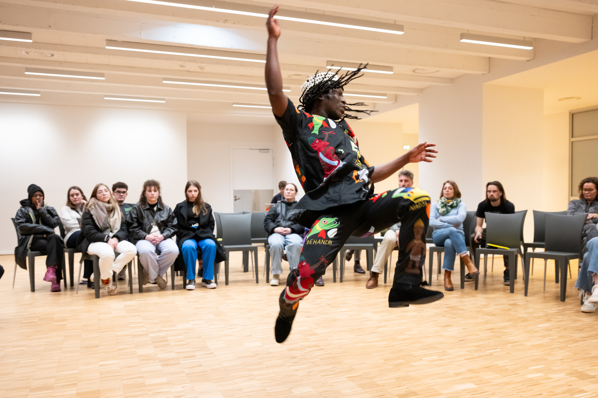 Folly Romain Azaman est un artiste béninois qui insuffle une vie nouvelle aux rythmes ancestraux du Vodoun. Né en 1997 à Cotonou, il baigne dès son enfance dans cet univers spirituel, bercé par les chants, la percussion et les danses de sa mère, vodounssi dévouée, et les incantations de son père, hounnon respecté. C’est de cette source intarissable que jaillit sa musique polyrythmique intimiste, une fusion envoûtante de blues, jazz, musique impro avec la danse, l’expression du corps et visage, la sensation et la connexion, rythmes traditionnels et de modernité audacieuse. Sa voix, à la fois cristalline et androgyne, se faufile dans les cœurs, passant du murmure le plus tendre à la puissance incantatoire, créant une onde émotionnelle qui transcende les langues. En 2021, il rencontre Betty Tchomanga et collabore en tant que musicien, interprète et danseur sur les pièces Leçons de Ténèbres, Histoire(s) Décoloniale(s) #Folly et Histoire(s) Décoloniale(s) #Portraits croisés.